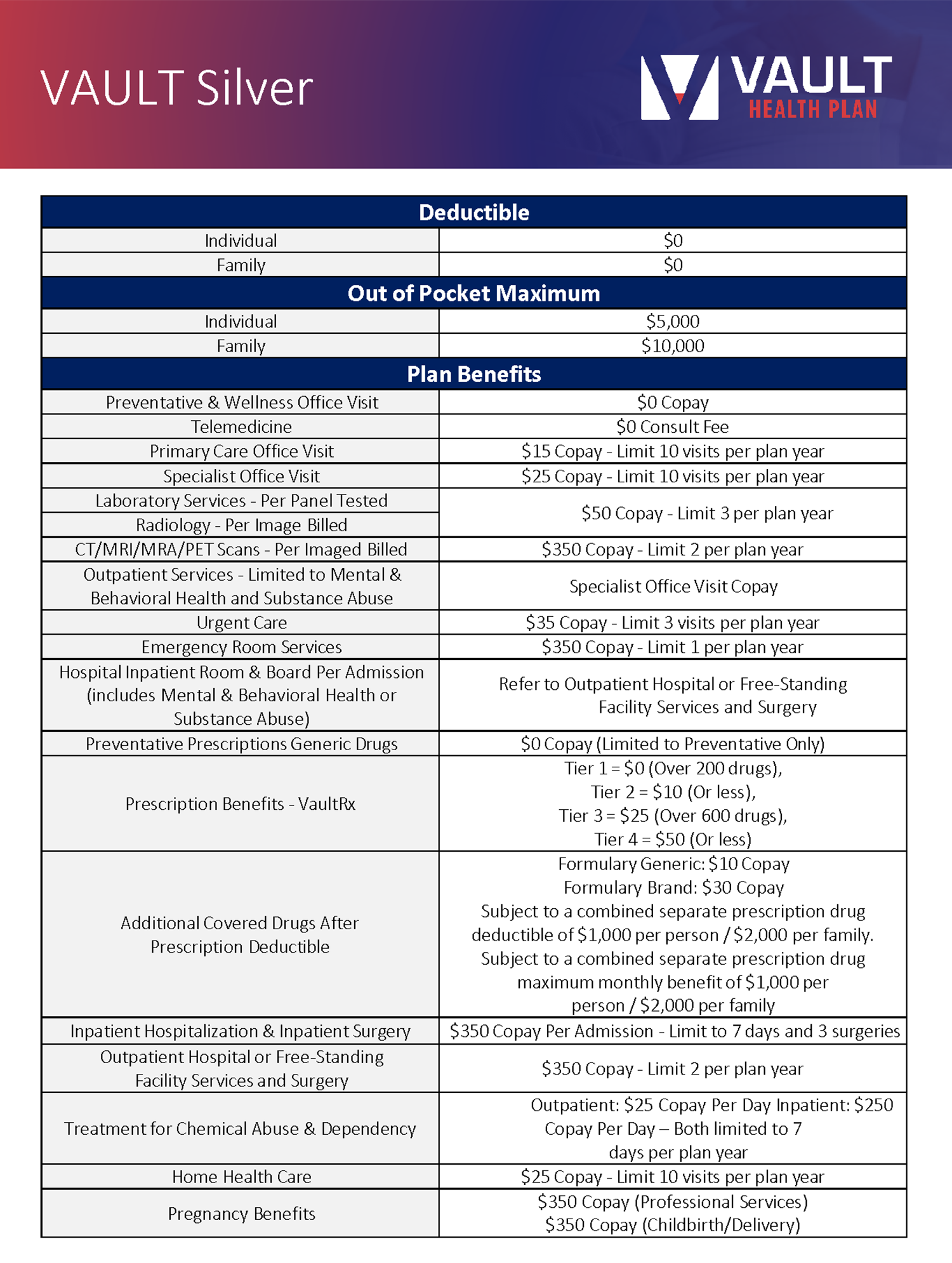 Important Note Regarding IP/OP/Surgery Services Performed at a Hospital:This plan does not utilize a network for any facilities. All services performed in a medical facility (for example, a hospital as opposed to a primary care physician’s office) will be subject to Reference Based Pricing (RBP) reimbursements based on a multiple of the Medicare Reimbursement Rate. Prior authorization needs to be obtained for some benefits offered in the plan. Please refer to the schedule of benefits for a more in-depth list of Benefit Coverage, Limitations and Exclusions. Out of Network services, and services provided at a hospital, will not be covered, unless otherwise specified.